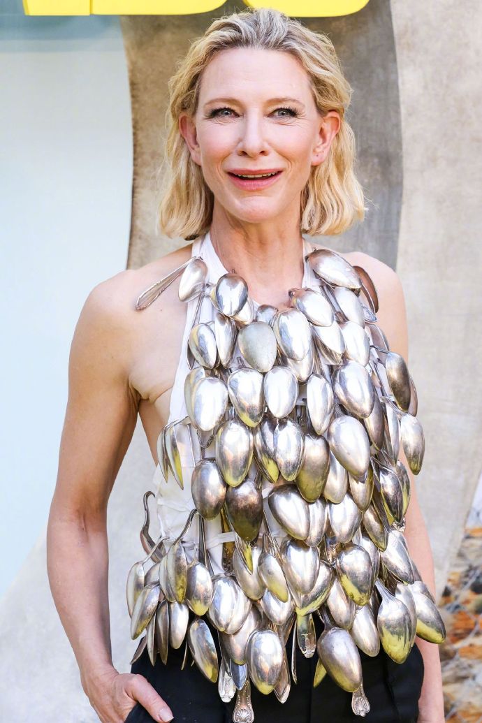 凯特·布兰切特身着的这件上衣,无疑是当晚最引人注目的存在。Hodakova品牌创始人Ellen Hodakova Larsson以其独到的创意和对环保材料的执着追求,将102把勺子巧妙编织成一件充满未来感的艺术品。