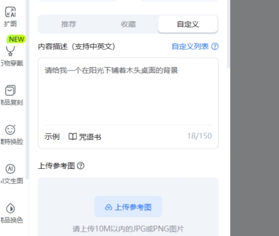 第三步:自定义化调整。如果你觉得这些都不够酷炫的话,也可以进行更灵活的自定义场景——这一环节允许大家自行设定想要的效果,比如说您可以告诉易可图“我想要一个带有阳光照射下的木质桌面上面放置物品的效果”,或者是您把自己喜欢的一张照片发送给易可图后,让其通过学习您的偏好来进行下一步的工作,最终得到相似的场景效果。