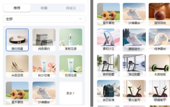 第二步:选择合适的场景。接下来就是为我们的商品挑选一个好的展示环境,易可图已经为我们准备好了上千种不同的背景类型供用户进行挑选,我们任意单选或多选场景即可。