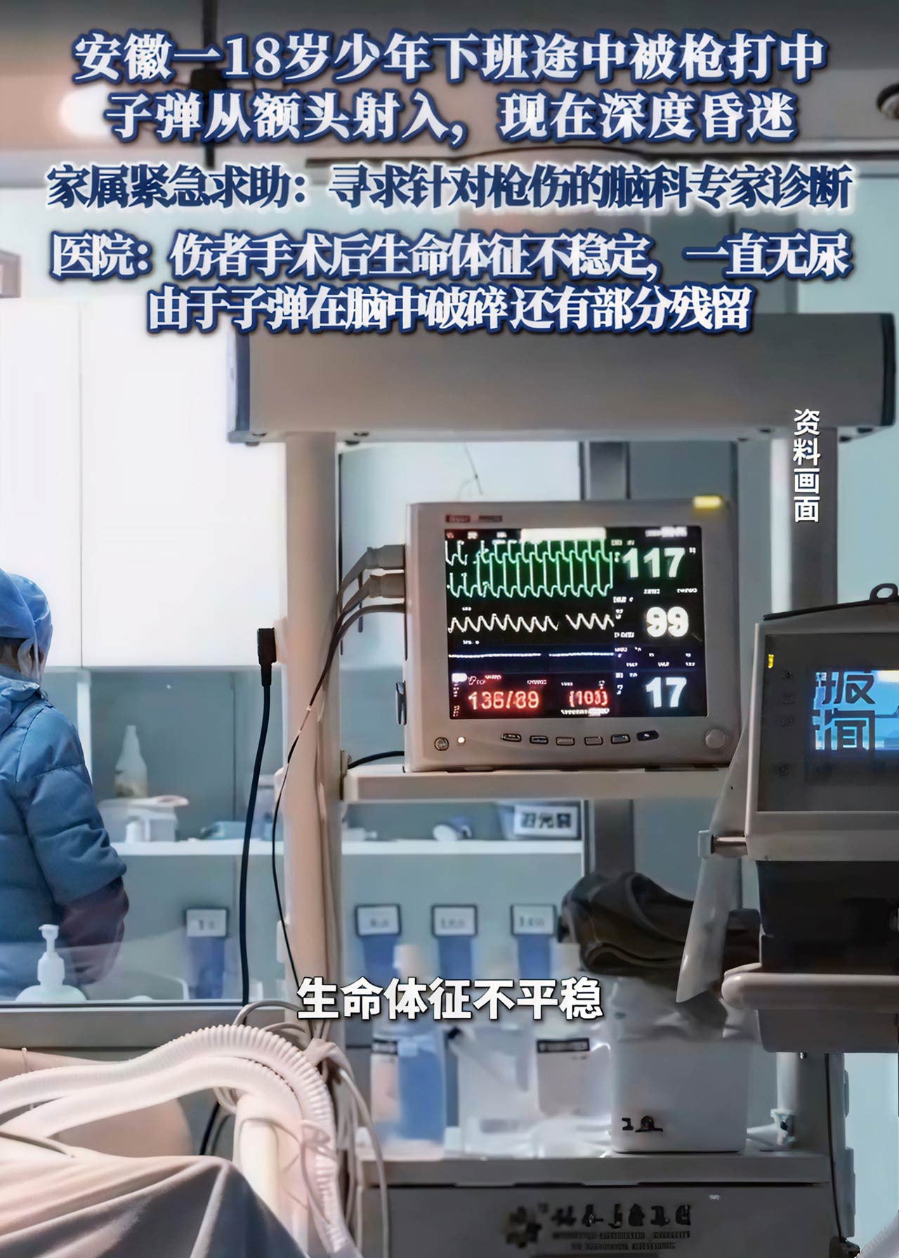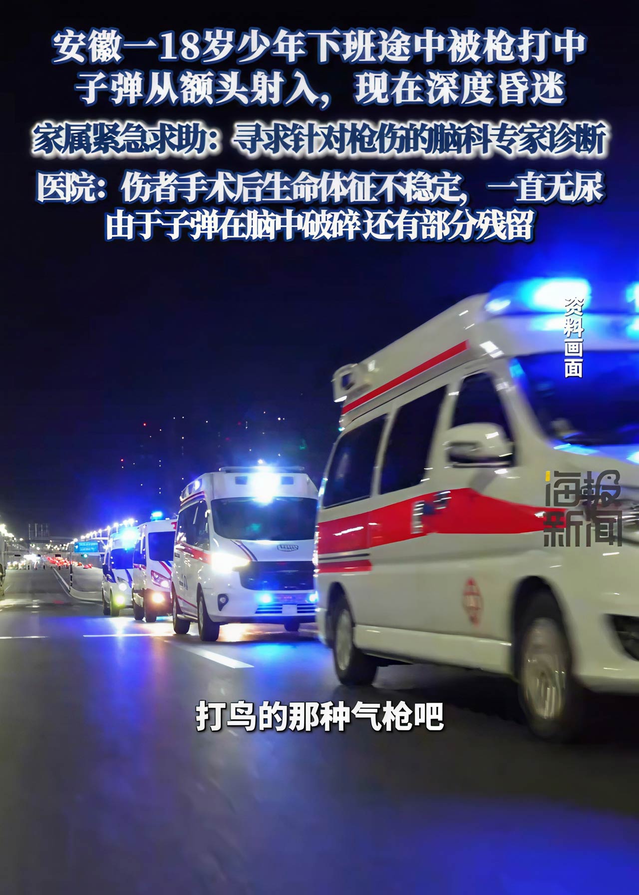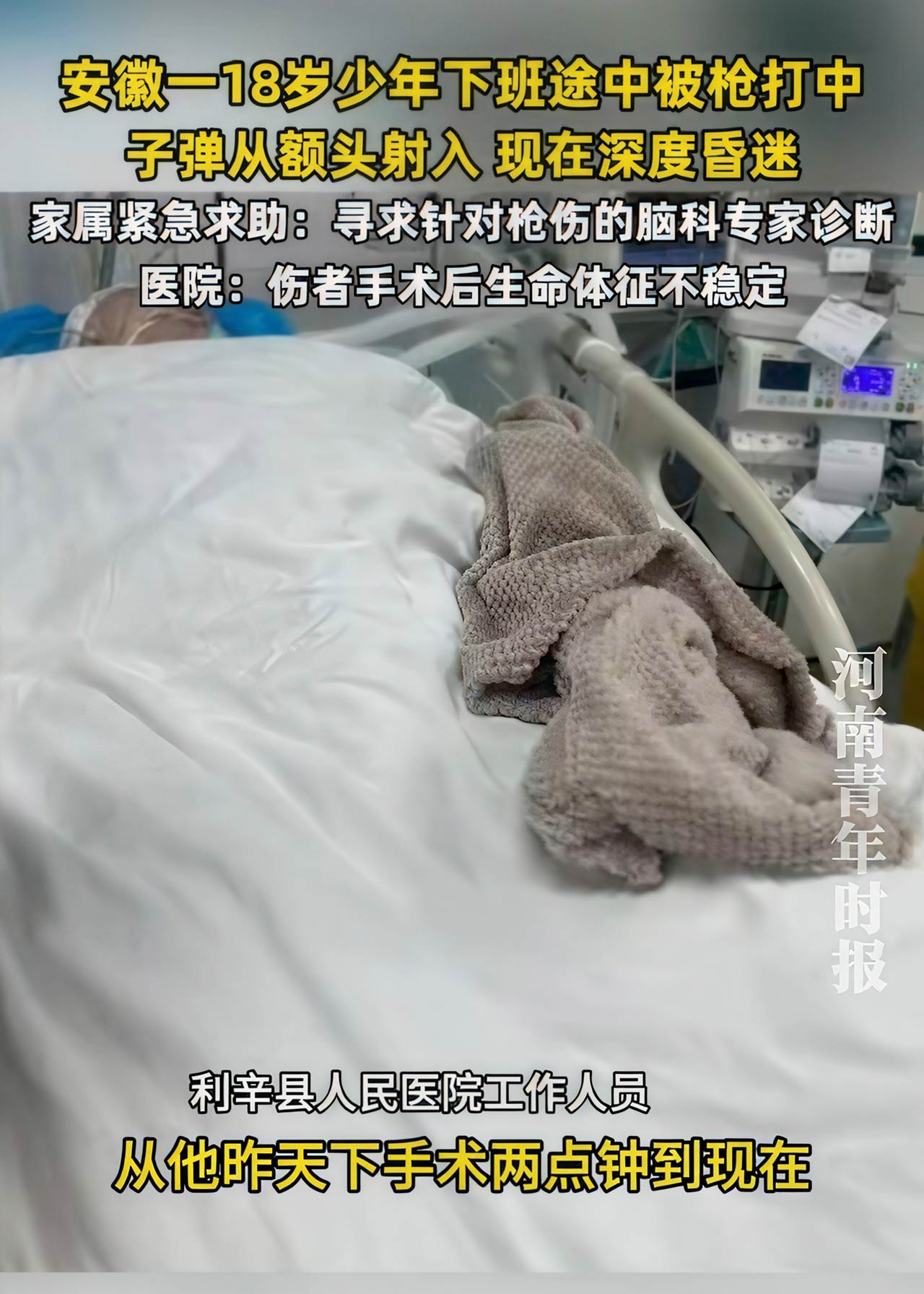 10月20日凌晨1时许,安徽亳州利辛县一名18岁少年在下班回家途中,不幸被气枪子弹击中头部。据家属透露,事发时孩子正步行回家,突然额头中弹,随即被紧急送往利辛县人民医院抢救。