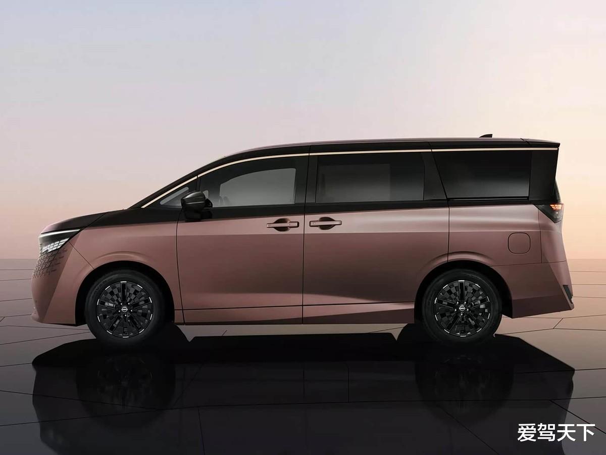 车身侧面,双拼色车漆让全新日产Elgrand看上去更加潮流,车身运用大量锐利的线条勾勒,展现出不错的力量感。值得一提的是,那犹如棋盘格的轮毂造型、独特的D柱设计,以及车窗上方金色饰线的加入,不仅削弱了传统MPV的商务气息,还增添了辨识度。此外,全新日产Elgrand后排使用了双电动侧滑门。