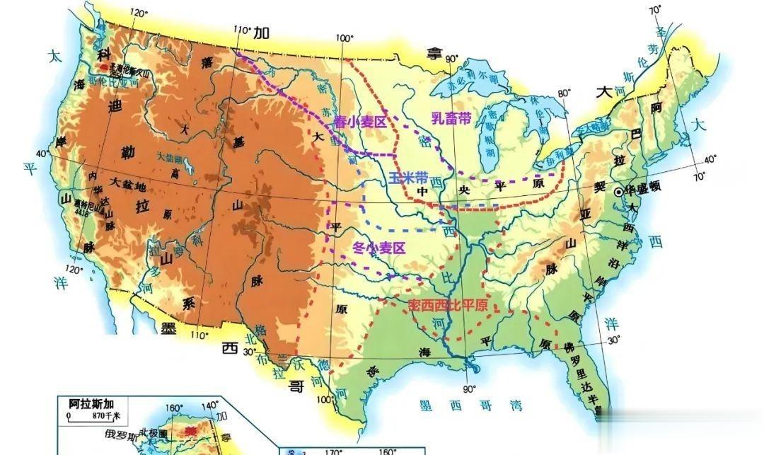 而美国的地形看着平坦,实则有个致命的缺陷,那就是全境几乎没有东西走向的山脉。