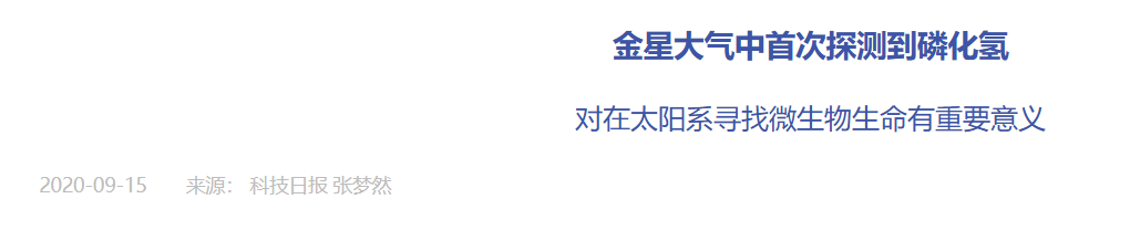2020-09-15 科技日报 金星大气中首次探测到磷化氢,对在太阳系寻找微生物生命有重要意义