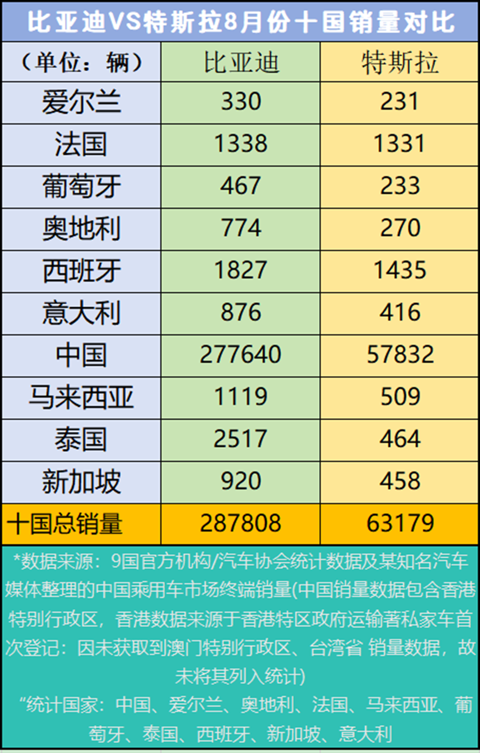 2025年8月份,比亚迪在爱尔兰、法国、葡萄牙、奥地利、西班牙、意大利、中国、马来西亚、泰国、新加坡这些国家的销量,均超过特斯拉,比亚迪十国总销量是287808辆,是特斯拉的4.5倍之多,特斯拉十国总销量是63179辆。
