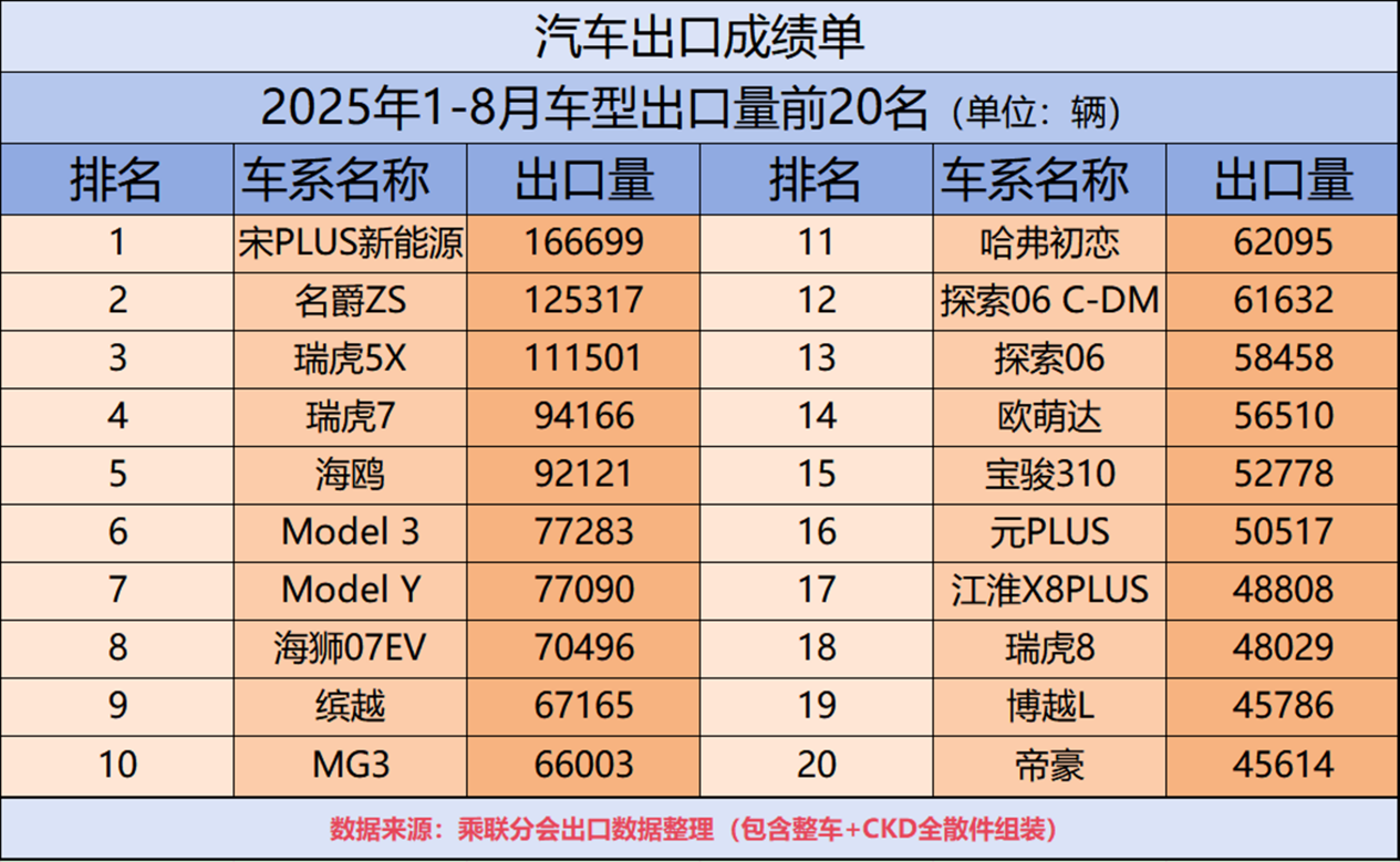 2025年8月份,比亚迪出海再秀亮眼成绩,在生产厂商乘用车出口量排名中,以79603辆的成绩位列第二,同比增长154.5%,增速排名第一。1-8月,比亚迪汽车累计出口量达601065辆,其中宋PLUS新能源在海外市场比较受欢迎,销量达166699辆,成为1-8月单车出口量第一名。