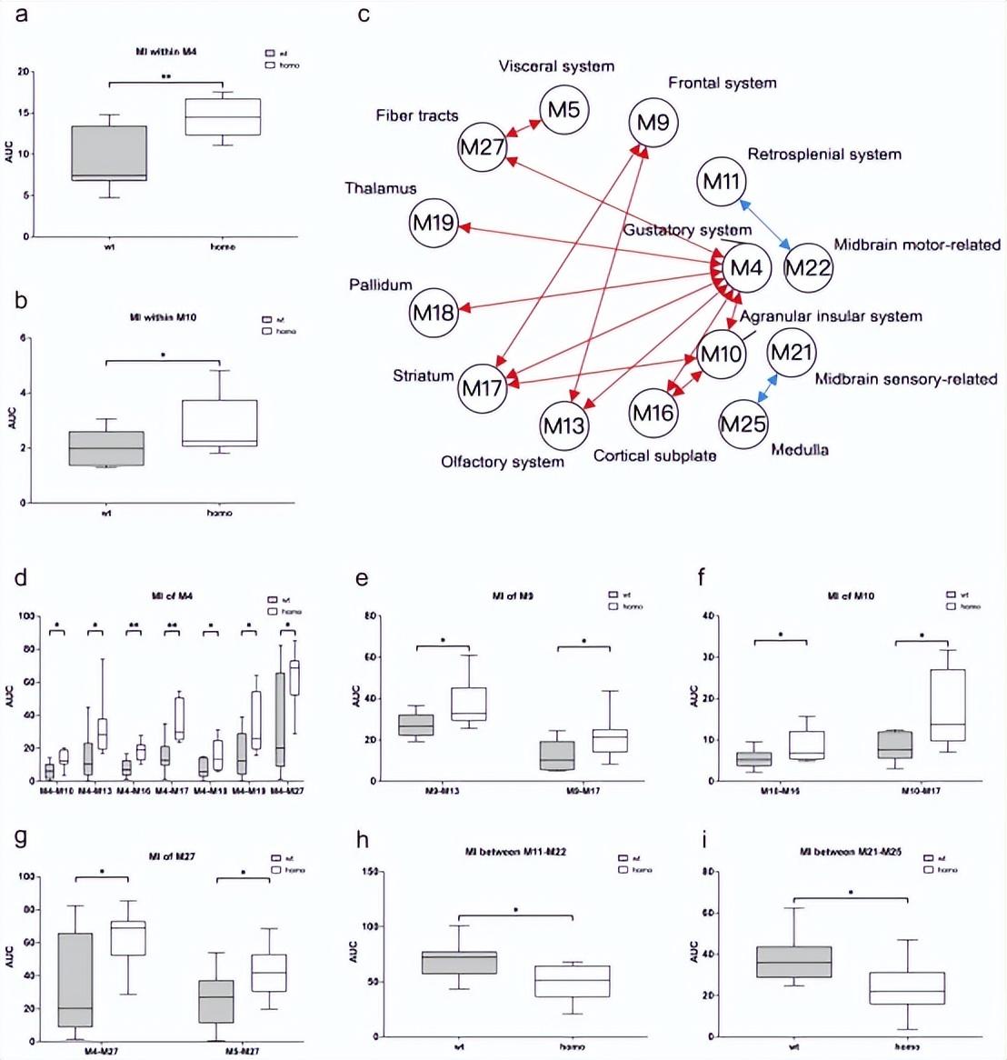 在幼年小鼠中,该文研究者观察到味觉系统(M4)和无颗粒岛系统(M10)脑区内的功能连接显著增强(图3a-b),而成年小鼠在听觉系统内(M6)脑区内的功能连接显著减少(图4a)。这些发现表明,幼年Nrsn2-/-小鼠在味觉信息整合和情绪处理方面可能存在功能异常,而成年Nrsn2-/-小鼠在听觉信息整合方面可能存在异常。无颗粒岛(又称岛皮层的前部)由背部和腹部组成。早期研究表明,在人类和灵长类动物进行认知任务期间,无颗粒岛背部部分显著激活。在人类fMRI研究中,无颗粒岛腹部在情绪意识期间表现出显著激活。另一项研究强调了无颗粒岛在恐惧记忆和焦虑调节中的重要作用。此外,在幼年组中,大多数脑区间的功能连接增强,而在成年Nrsn2-/-小鼠中,大多数脑区间的功能连接减弱。这表明Nrsn2在不同发育阶段对不同脑区发挥特定作用。