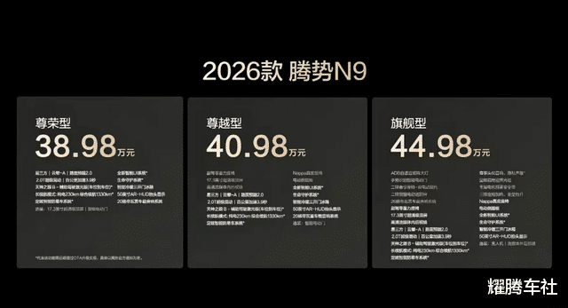 2025年9月17日,腾势汽车旗下的科技安全旗舰SUV 2026款腾势N9正式迎来上市,作为年度改款车型,新款N9在延续现款核心优势的基础上,进行了细节优化与配置升级,目标直指高端大型SUV市场,此次新车共推出了X款配置,指导价38.98万—44.98万,接下来我们就从多个维度来看看这款车型的表现吧。