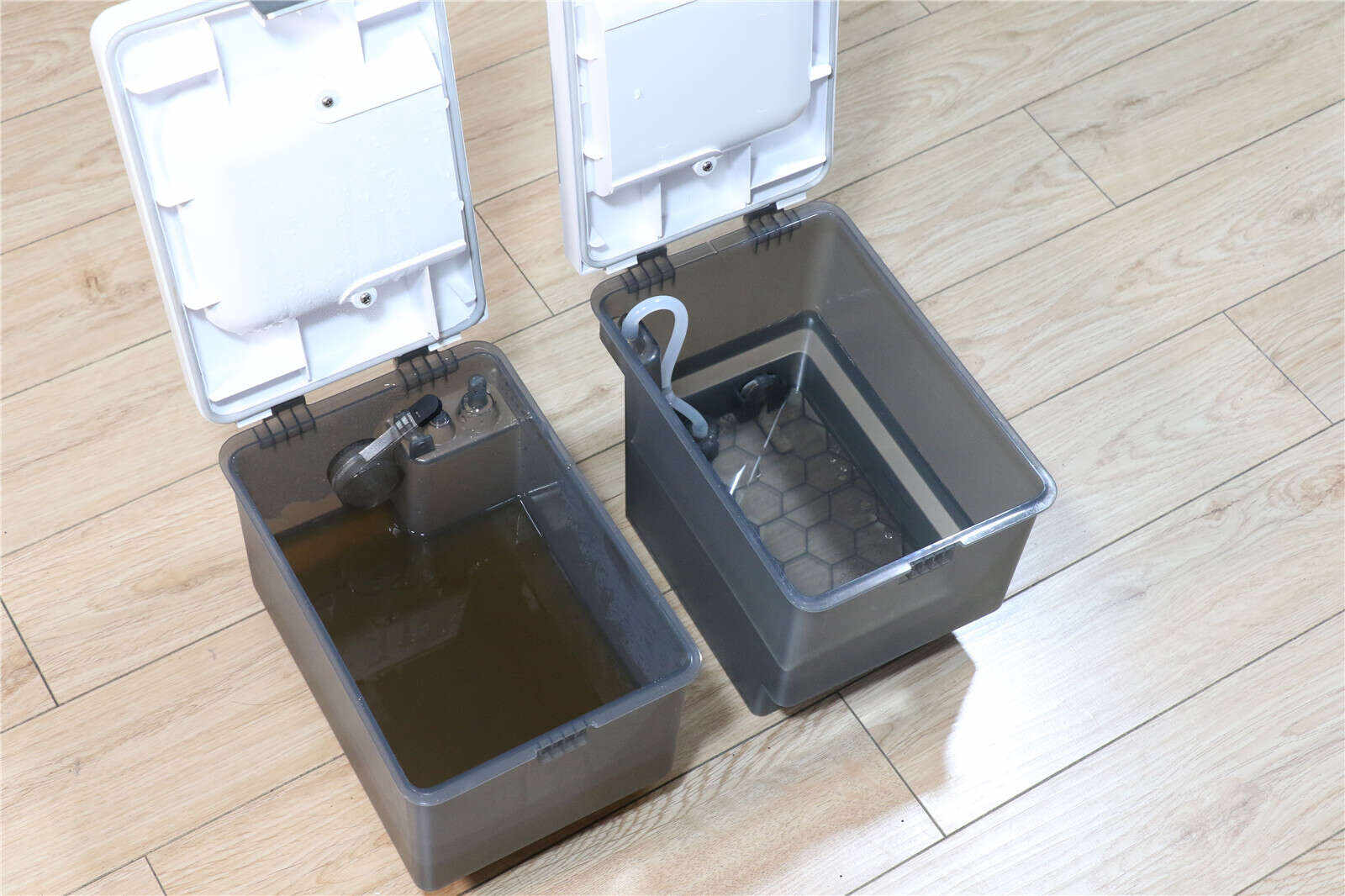 地宝返回基站自动清洗后,打开两个水箱查看,左边污水箱回收了大量废水,且箱盖上的水珠也表明是热水。右边清水箱水位下降,代表了洗净滚筒的耗水量。