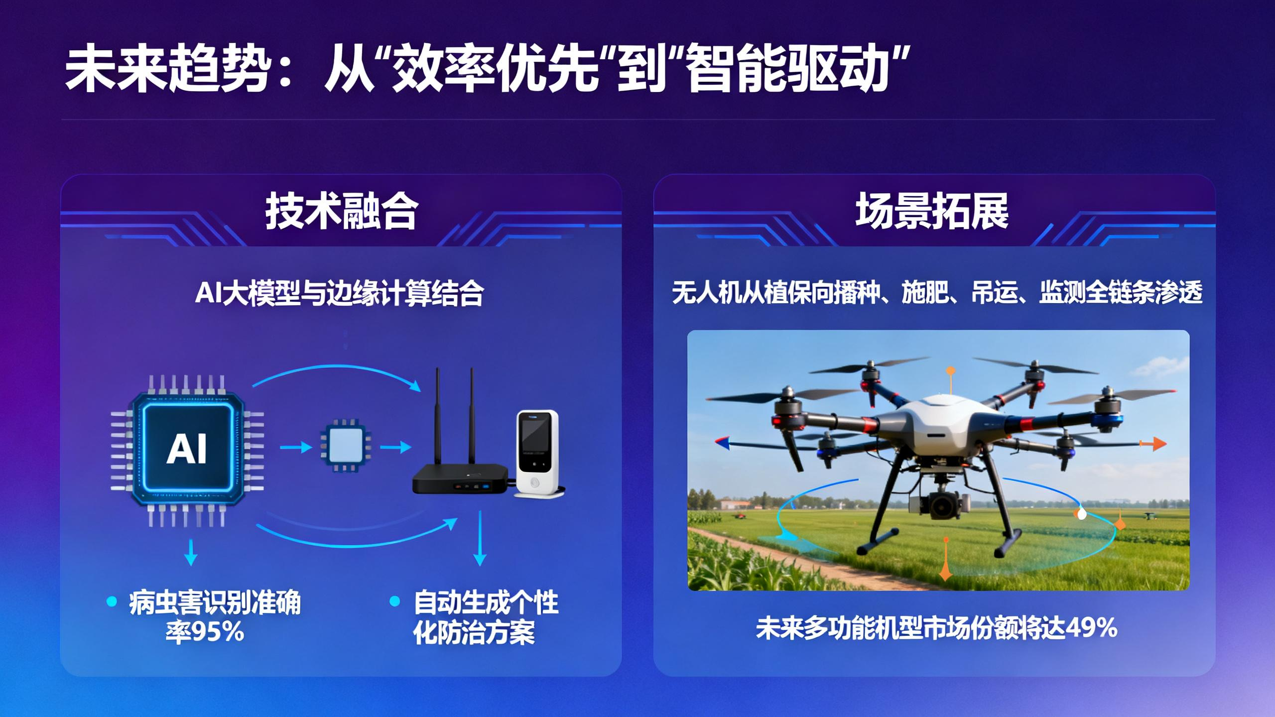 场景拓展:无人机从植保向播种、施肥、吊运、监测全链条渗透,未来,多功能机型市场份额将达 49%。在云南茶园,无人机搭载激光雷达实现茶叶采摘导航,效率提升 30%。