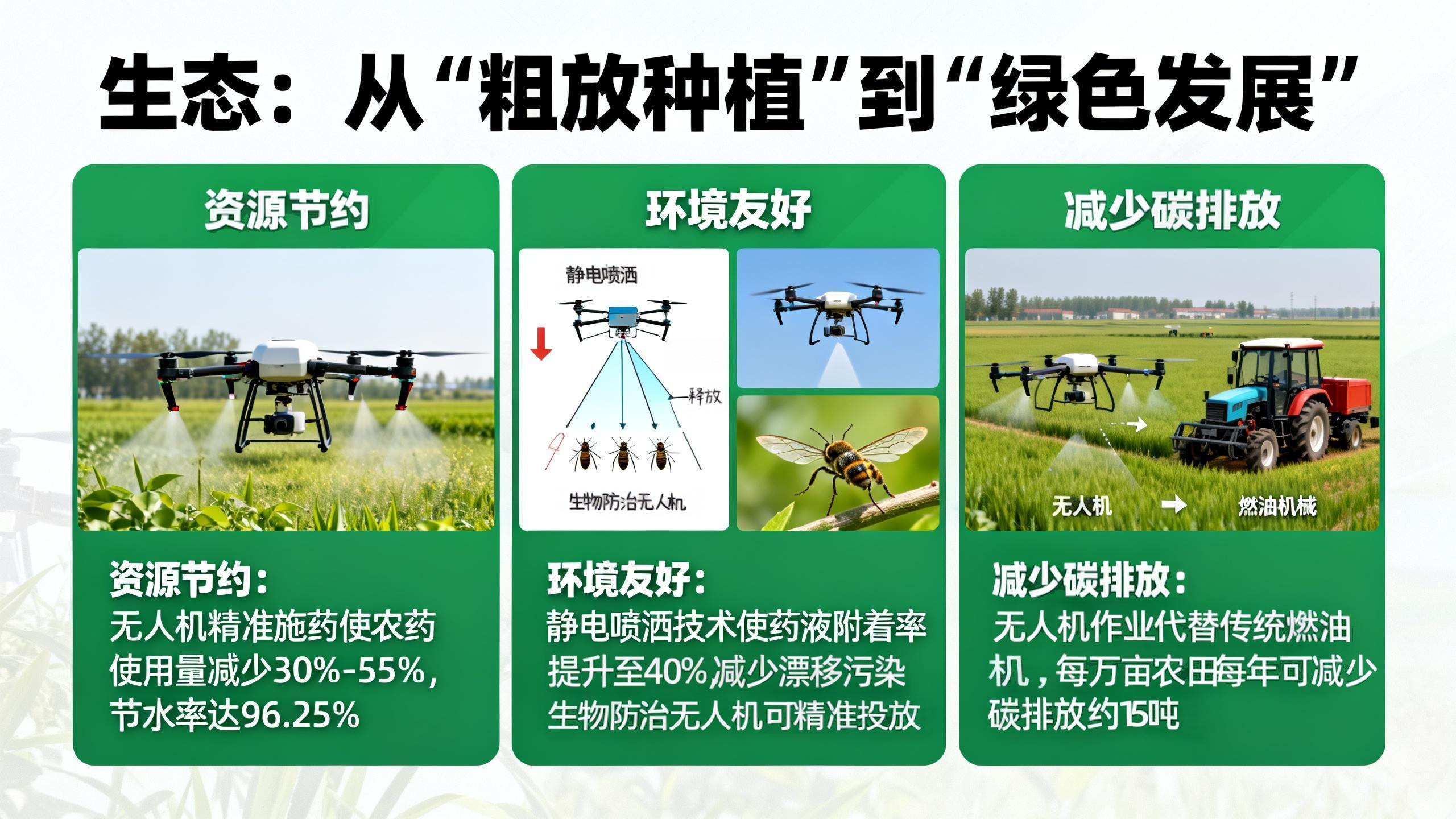 环境友好:静电喷洒技术使药液附着率提升至 40%,减少漂移污染;生物防治无人机可精准投放天敌昆虫,替代化学农药。