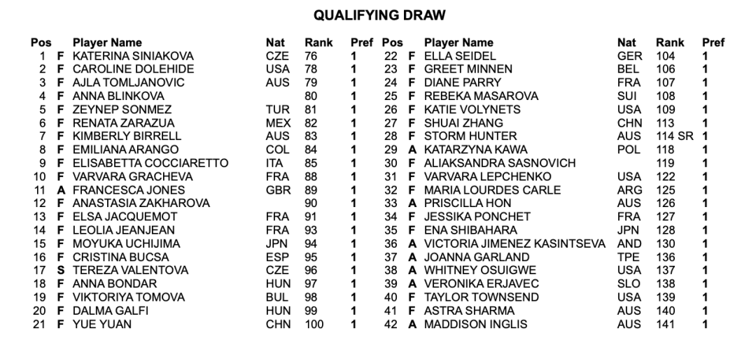 此外,女双“金满贯”、今年温网淘汰郑钦文的西尼亚科娃 ,前温网八强汤姆贾诺维奇,刚刚在美网首进大满贯16强的西班牙球员布克沙等也将出战女单资格赛。而王曦雨、韦思佳、郭涵煜等中国金花则在替补名单中,同样非常有希望亮相今年中网。