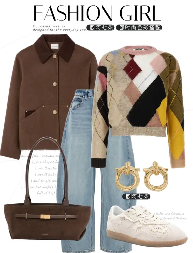 上身选择一件棕色灯芯绒领羊毛夹克,厚实质感与复古光泽自带温暖滤镜。内搭一件粉拼咖菱形格纹毛衣,柔和的粉与稳重的咖在几何图案中交织,为整体注入恰到好处的甜美与层次感。