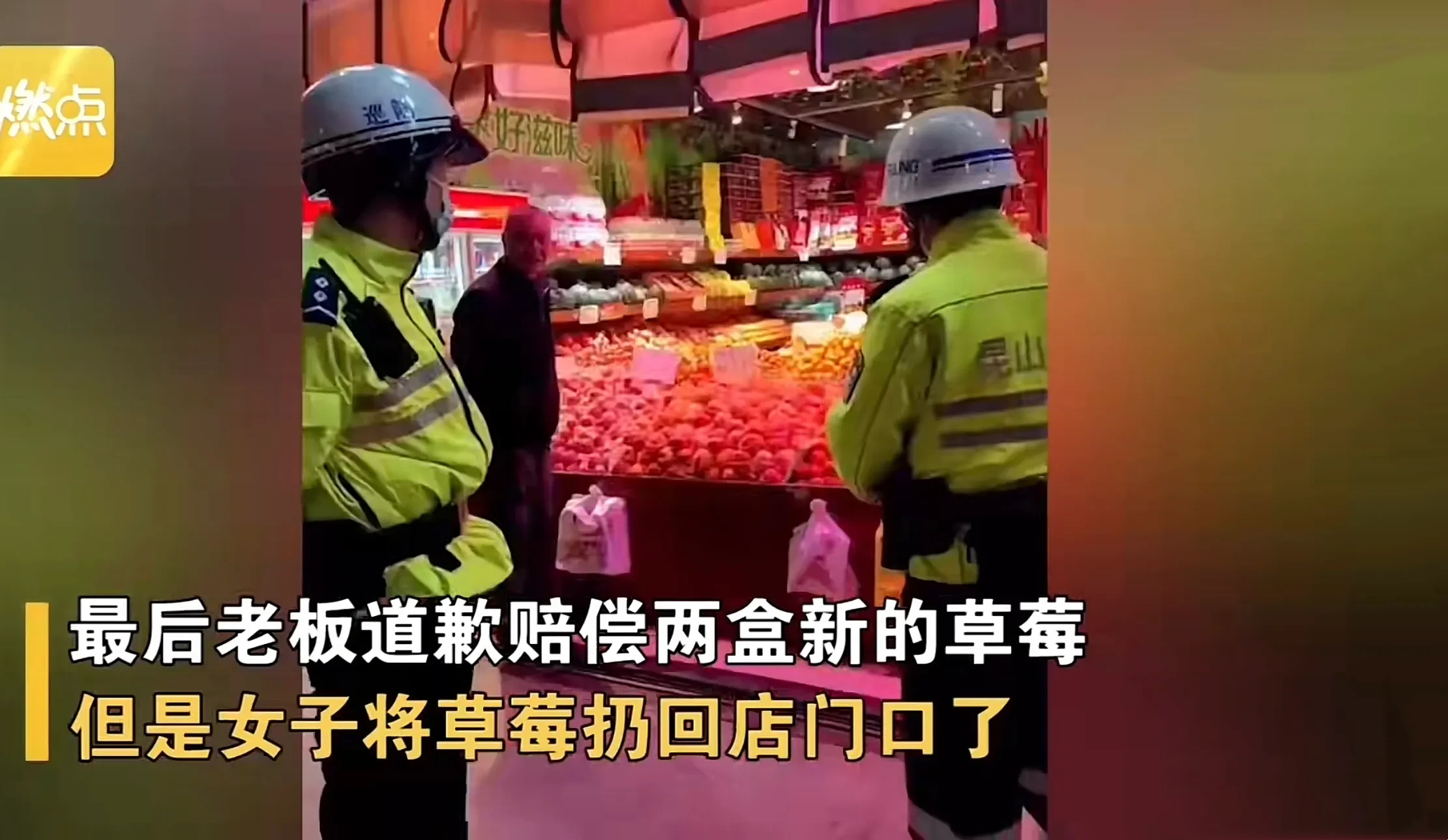 在女子仔细检查其他包装时,发现该店所有盒装草莓均采用相同手法掩盖劣质果品。当她提出退款要求后,店主情绪激动,甚至拿起扫帚作出威胁姿态。即便在辅警赶到现场后,店主仍态度嚣张。最终经民警调解,店主道歉并赔偿两盒草莓,但女子拒绝接受并将草莓扔回店内。