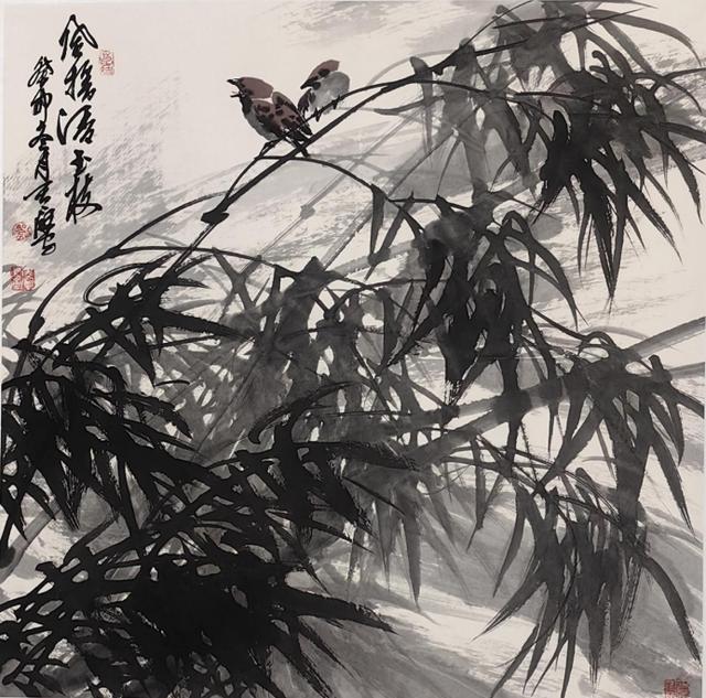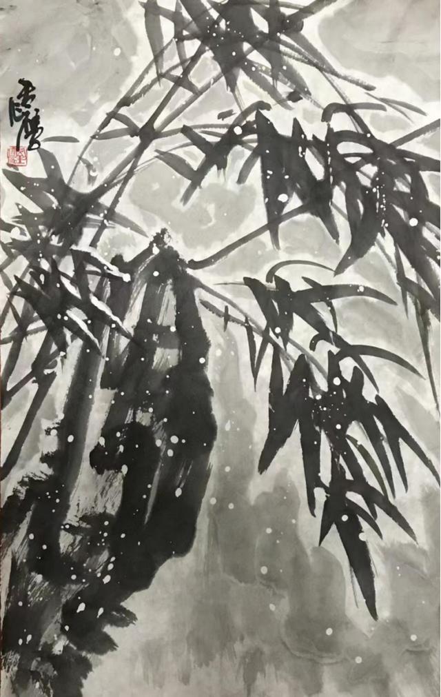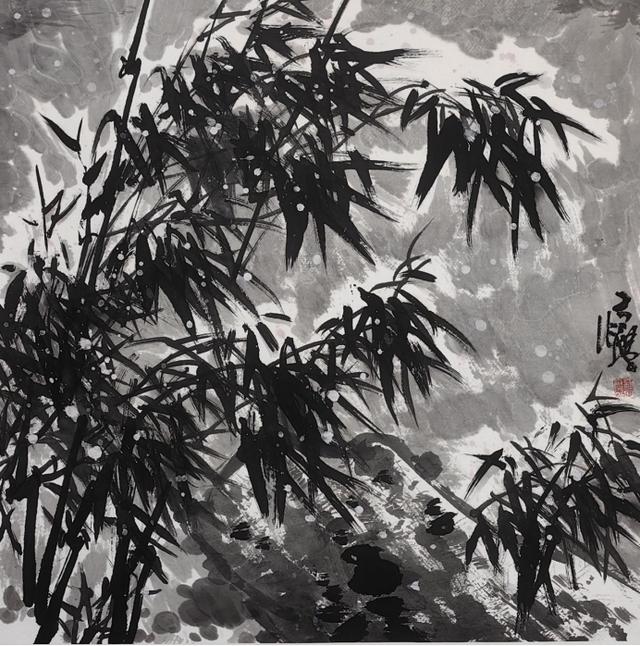 天鹰老师谦谦如君子,其笔下的竹虽形态万殊,但株株皆有君子之风。天鹰酷爱竹子,观竹、品竹、悟竹,以期成竹在胸。创作的作品中既有风和日丽下的儒雅之气,也有疾风暴雨中的倔强不屈……丰富了竹的形态,获得了新的感受,悟出了更深一层的内涵。清代画竹名家郑板桥在《题画》中自述其画竹的过程:“江馆清秋,晨起看竹,烟光、日影、露气,皆浮动于疏枝密叶之间。胸中勃勃遂有画意。其实胸中之竹,并不是眼中之竹也。因而磨墨展纸,落笔倏作变相,手中之竹又不是胸中之竹也。