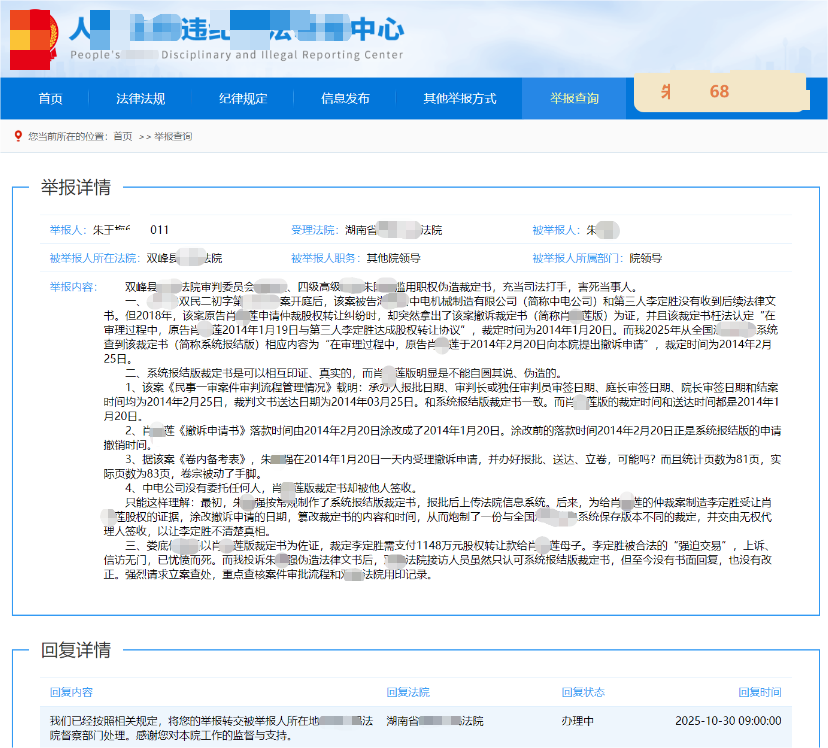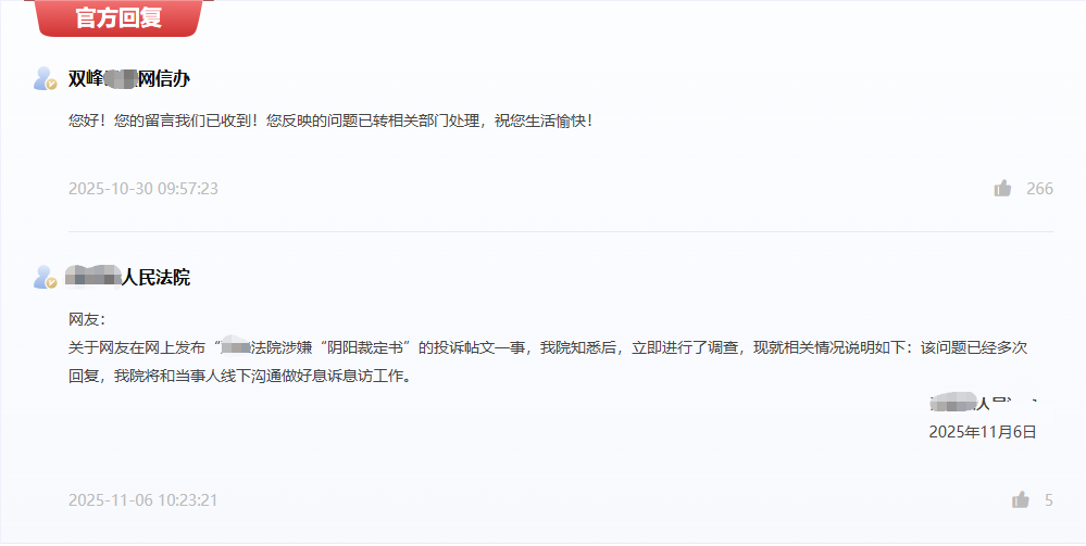 2025年10月28日,网友朱玉梅在湖南某网一档节目栏目发布投诉帖《双峰某法院涉嫌“阴阳裁定书”》,反映该法院一起案件存在两份作出时间、核心内容不一致的撤诉裁定书,已影响相关仲裁裁决结果及当事人合法权益。
