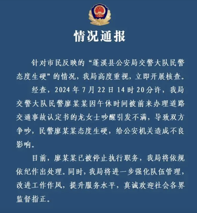 官方回应:交警大队的处理措施面对网友的热议,蓬溪县交警大队迅速作出了回应。大队召开了紧急会议,表示将对涉事交警进行处理。官方微博也发布了道歉声明,强调“礼”字当头,表示尊重是公职人员应有的基本素养,并承诺将对该名交警进行严肃处理。然而,处理结果并未完全平息事态,反而引发了更多争议。