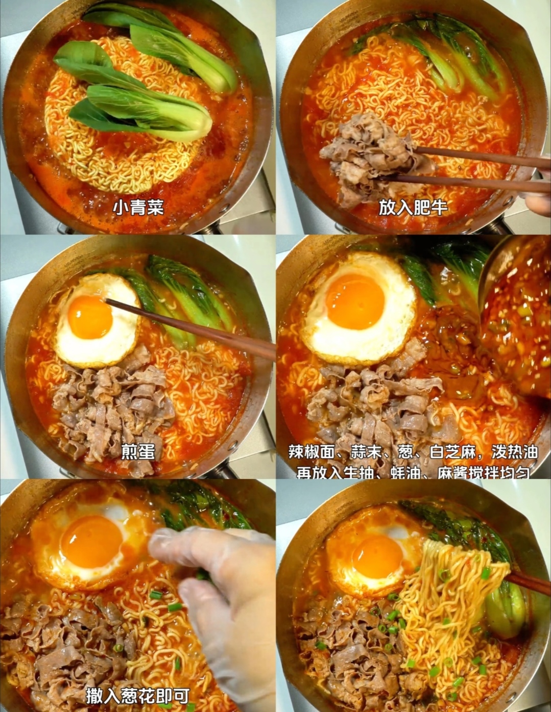 5. 加入配料:面条快煮熟时,加入小青菜和之前煮好的肥牛卷,再打入一个鸡蛋,煮至鸡蛋凝固成荷包蛋。小青菜的加入不仅增加了色彩,也让整道菜更加营养均衡。