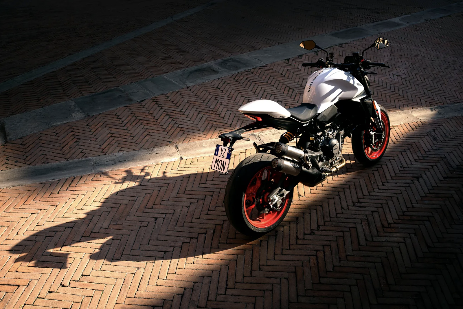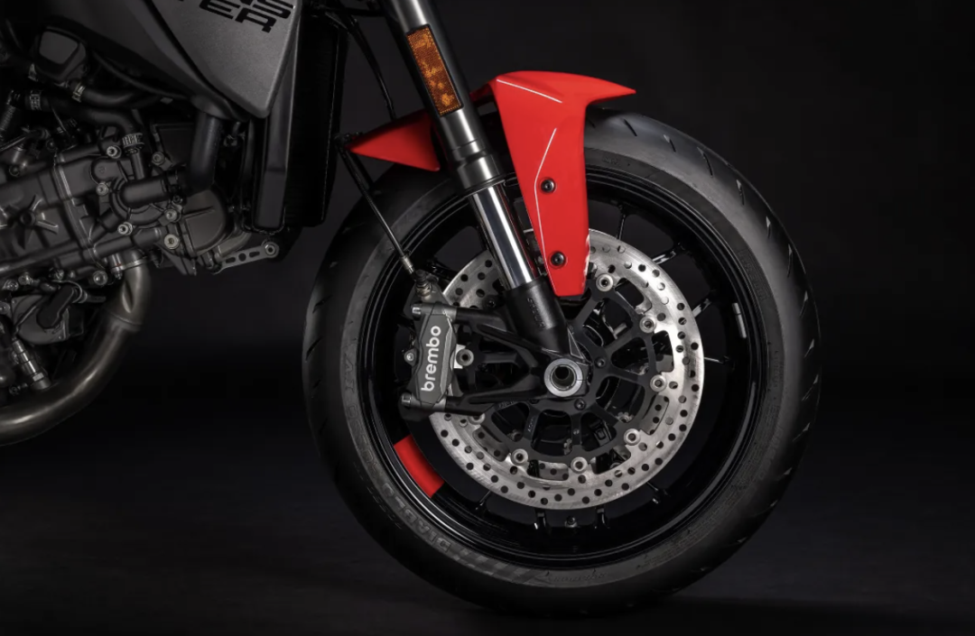 底盘方面新款Monster减震均由SHOWA(昭和)提供,其中前减震为43mm倒立式结构,不支持调节功能;后减震为中置结构,具备预载可调功能。刹车上则由Brembo(布雷博)提供,其中前刹车为M4.32对向四活塞辐射卡钳,配合320mm浮动式双碟盘,后刹为Brembo对向双活塞卡钳,配合240mm固定式单碟碟盘,轮胎则标配倍耐力Rosso IV运动轮胎。