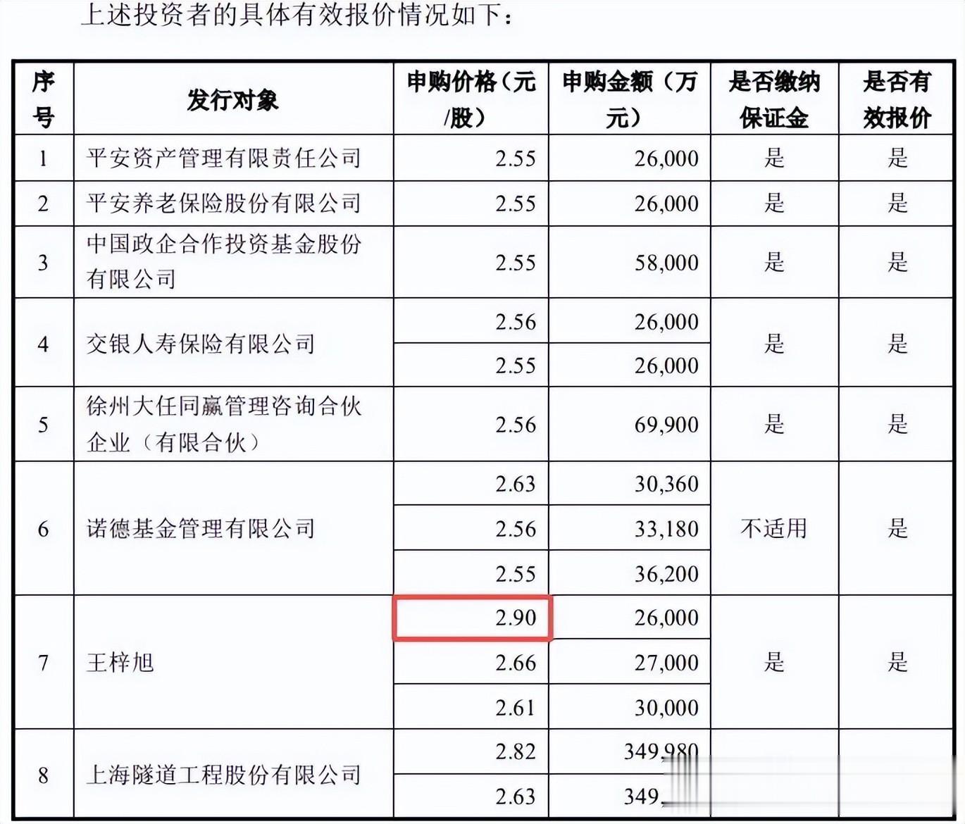 在申购报价环节,王梓旭直接给出了2.9元每股的最高申购价。要知道,定增的规则是价格优先,谁出的价格高,谁就能优先拿到股票份额。当时其他绝大多数大型机构的报价都在2.5元左右。
