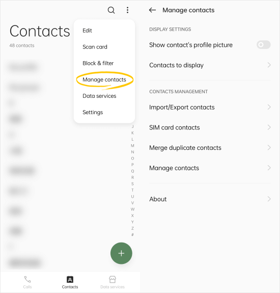 步骤一:打开Android设备上的“联系人”应用,找到“菜单”>“管理联系人”>“ SIM 卡联系人”。