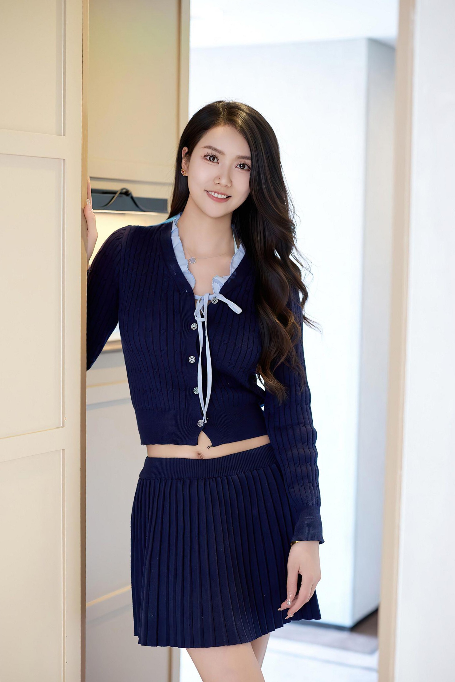 一位少女倚靠门框,身着深蓝套装,黑发卷曲,笑容甜美。蓝白配色清新,背景虚化,尽显青春活力。