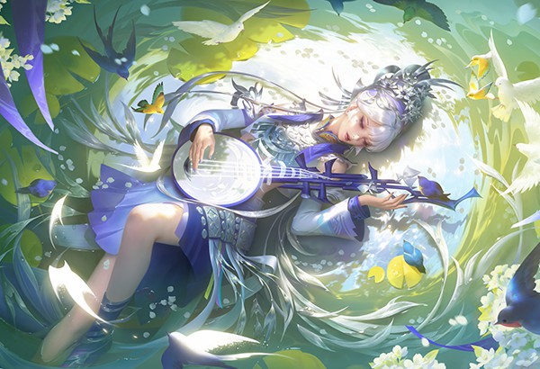 第三款,杨玉环的银翎春语。这款皮肤预热时阵仗很大,配套推出了专属击败特效、拖尾等,这通常是传说皮肤的待遇。虽然最终它以史诗品质上线,但特效依旧精致唯美。技能以银白色飞鸟和春日光影为核心,普攻与技能释放时羽毛飘散,大招绽放的银蓝花树优雅动人。整体特效的层次感和华丽度,确实堪比传说。这款皮肤的降级,也让更多玩家能够轻松拥有这份美丽。