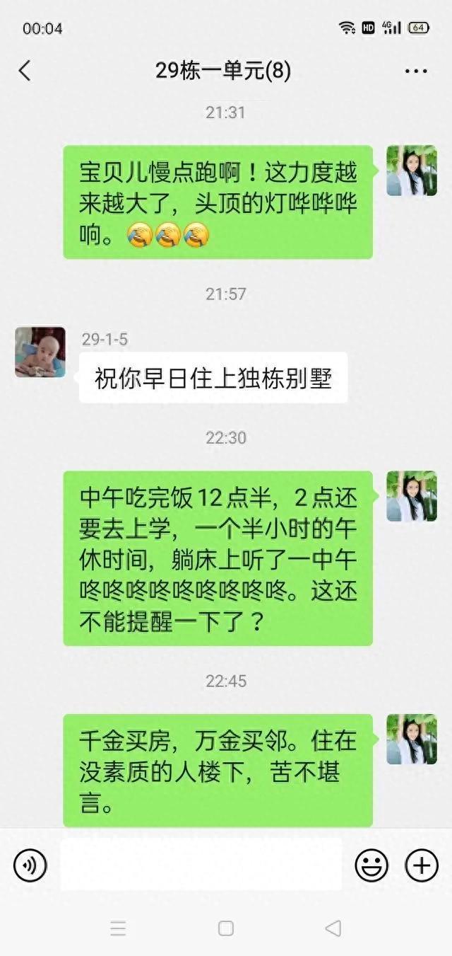 网友:就是素质的问题,我家楼上更特别,装空调不安冷热水管,打麻将通宵十二点是家里常便饭,自家有个小孩和牌友的孩子简直把客厅当儿童乐园,也不知这家人的心是怎么长着的!!!!