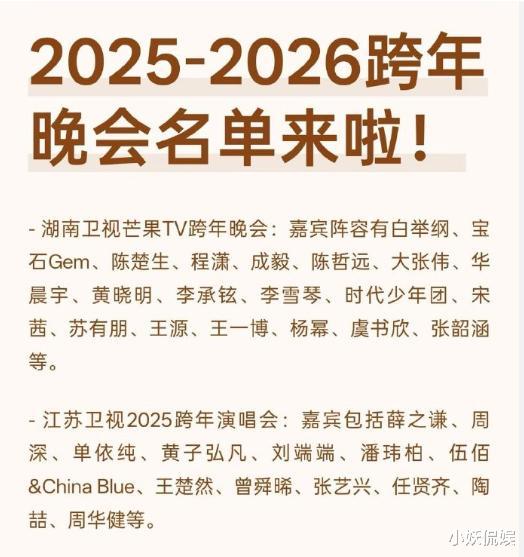 当湖南卫视与江苏卫视相继爆料出 2025-2026 跨年晚会嘉宾名单,单从阵容爆料来看,芒果跨年顶流集结、江苏卫视唱将天团引爆期待。一边是王一博、王源领衔的 "全年龄段狂欢阵容",一边是周深、伍佰压阵的 "听觉盛宴天团",两大卫视延续多年的跨年对决,在 2025 年末再度升级为 "流量狂欢" 与 "实力深耕" 的巅峰较量 —— 观众的遥控器,这次真要面临终极抉择了。