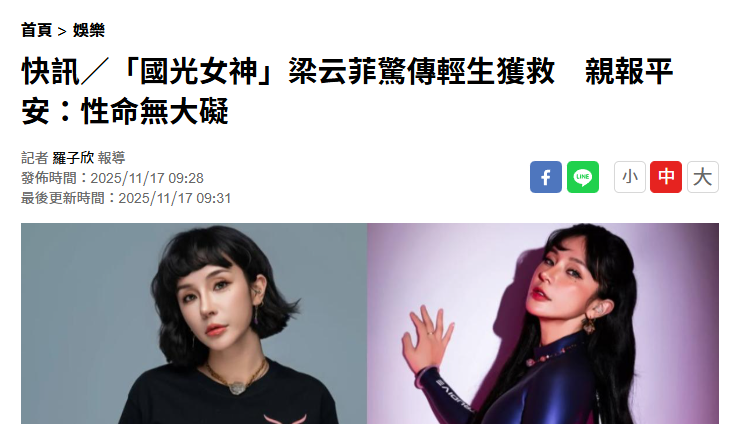 11月17日,台湾女艺人梁云菲被曝自杀获救,她本人在17日上午发文报平安。