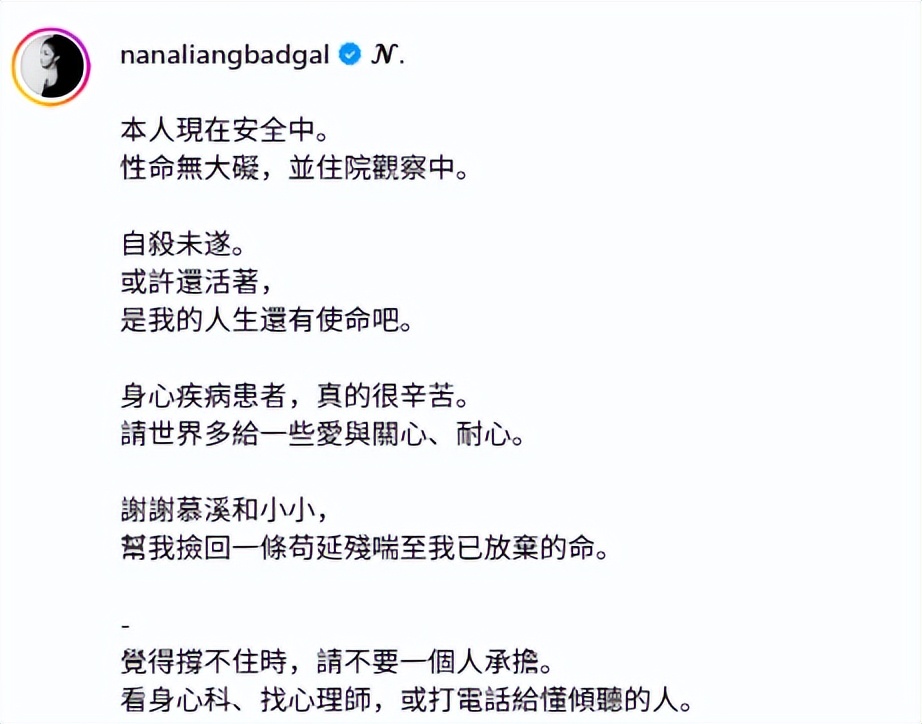 梁云菲承认自己自杀未遂,透露现在安全中,性命无大碍并住院观察。表示自杀未遂或许还活着,是自己的人生还有使命,身心疾病患者真的很辛苦,请世界多给一些爱与关心。她还感谢好友慕溪和小小,帮她捡回一条苟延残喘到已经放弃的命。