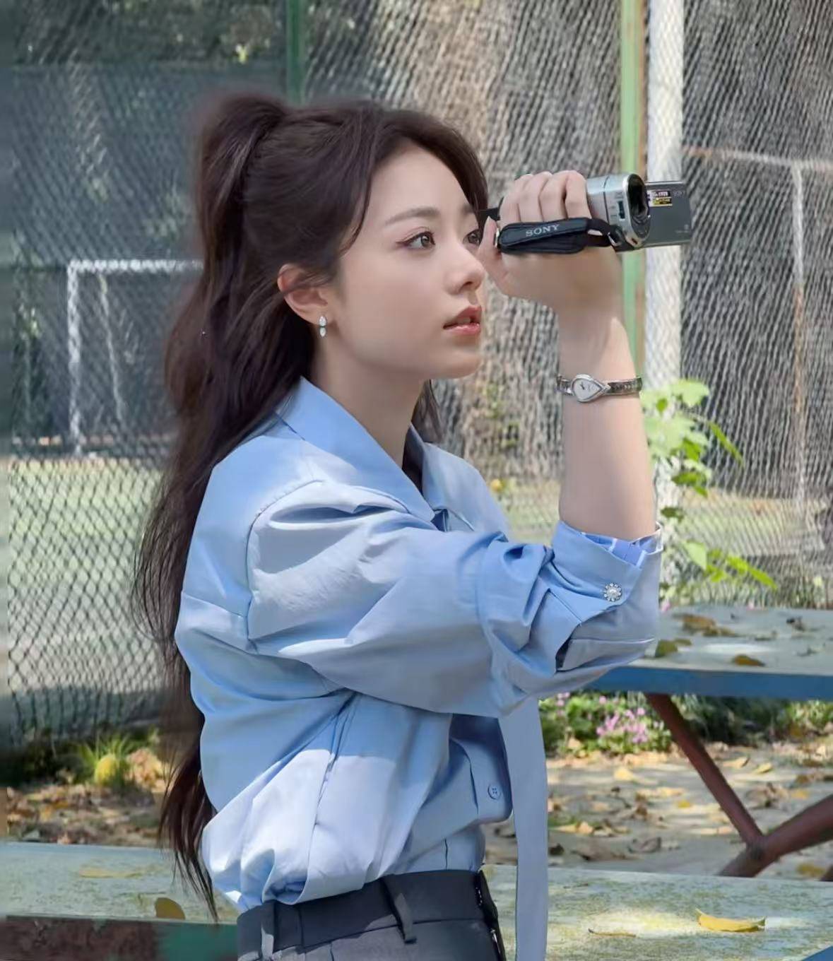 比如一件米白衬衫、一条雾蓝半裙、一个樱花粉丝巾,都会让你显得更有气色。