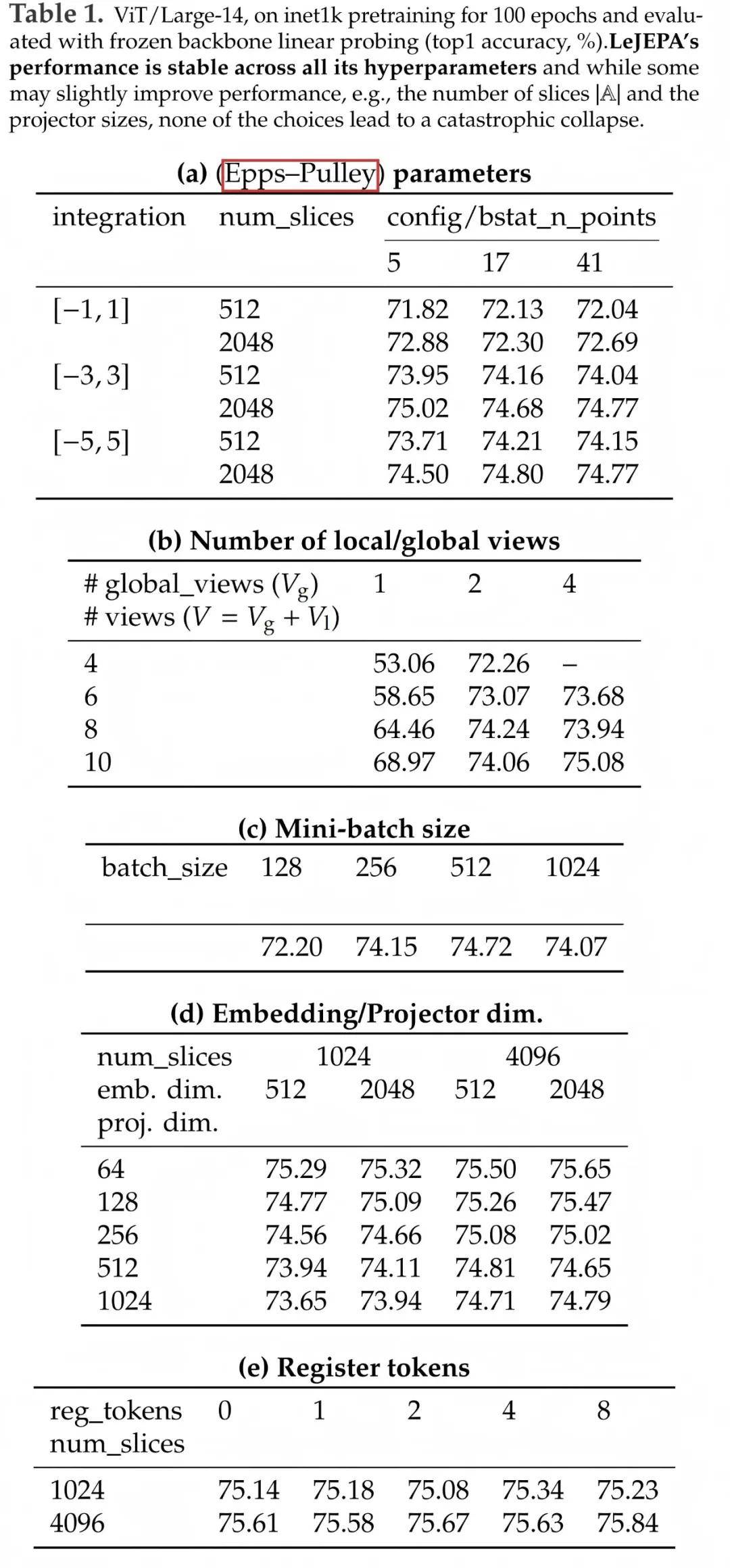 Epps-Pulley 超参数的稳定性 接下来研究检查了 LeJEPA 特有的超参数:SIGReg 的切片数量、(Epps–Pulley)检验的积分设置等。