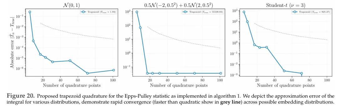 研究发现,即使节点数少至 17,简单的梯形求积法则也足够了(如图 20 所示)。另外,研究者利用被积函数的对称性来免费将节点数加倍(详见官方代码)。