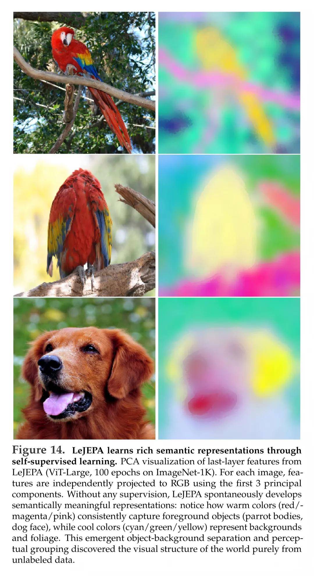 成功的自监督学习的一个标志是,在没有显式监督的情况下涌现出具有语义意义的注意力模式。为了评估 LeJEPA 是否学习了这种结构,研究者将其学习到的表示的注意力图进行了可视化。继 DINO 之后,该研究对嵌入应用 PCA(主成分分析)并可视化第一个主成分,其显示出与物体边界和显著区域的清晰对应关系(图 14)。