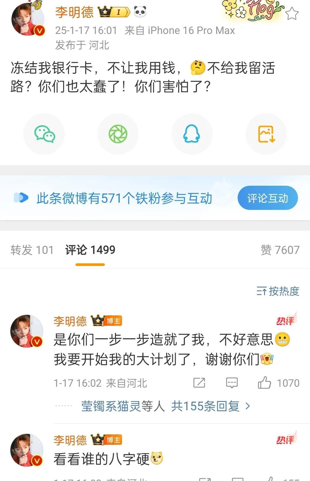 李明德的微博发飙事件,像是一场突如其来的暴风雨,迅速席卷了整个网络。银行卡被冻结的消息无疑是这场风波的导火索,而他在微博上的一系列言辞激烈的发言,则是火上浇油。网友们纷纷猜测,这一切是否与马天宇的法律行动有关。毕竟,前几日马天宇的起诉已经让两人的关系变得紧张,而冻结银行卡的举动更是让李明德感到无所适从。