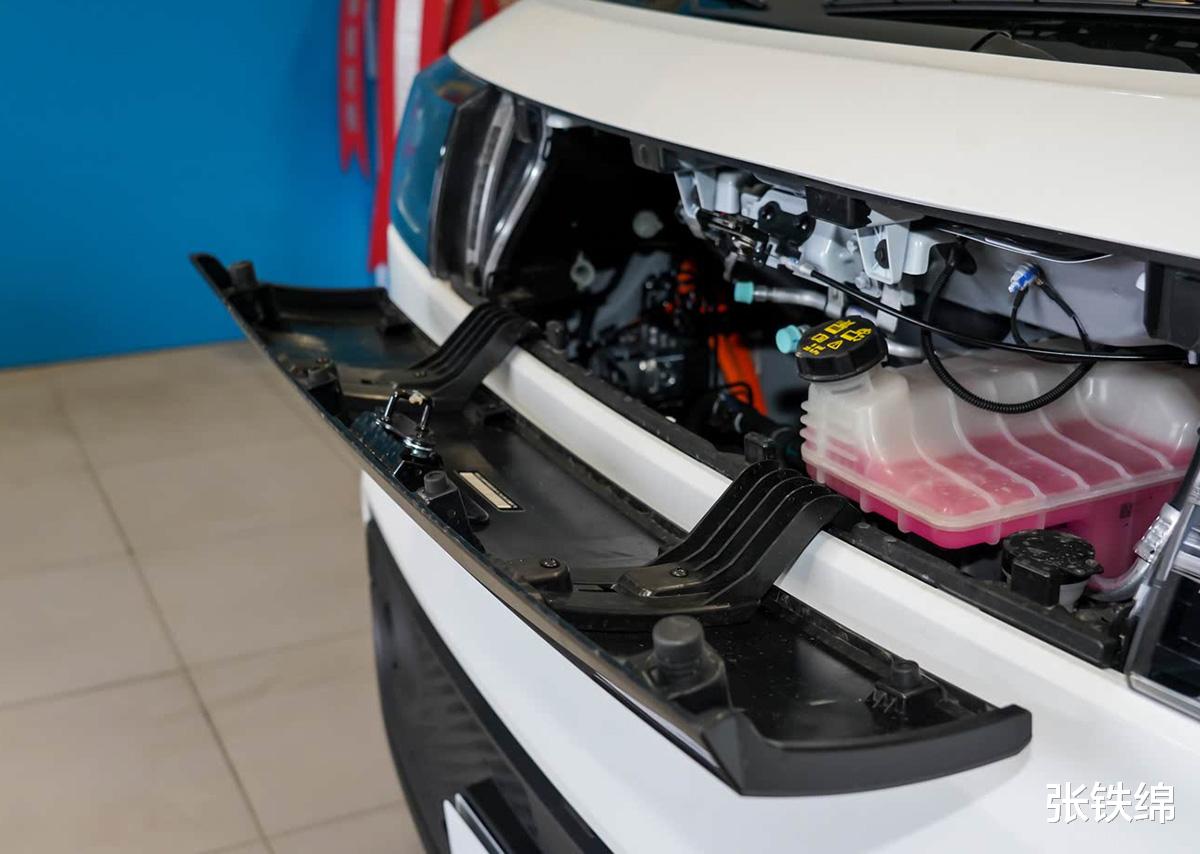 我们先来说增程器的布局问题。从申报图来看,增程版车型的整体外观结构和此前的电动版没有太大的变化,仅是对前杠造型进行了调整,这也就意味着车头部分的前机舱结构不会有太大变化,而通过电动版前机舱我们能够看到,其短鼻式的车头前机舱空间不大,在布局了玻璃水壶、刹车油壶、防冻液水壶以及ABS泵等配件之后,前机舱基本满了,放不下发动机了。