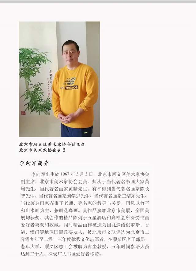 李向军,出生於1967年3月3日。北京市顺义区美术家协会副主席,北京市美术家协会会员。师从于当代著名书画大家黄均先生,当代著名画家黄麟先生,有幸得到当代著名画家陈长智先生,当代著名画家刘学思先生。当代著名画家王培东先生。当代著名画家齐秉正老师。等名家的教导与关爱,画风以竹子和山水画为主。兼画花鸟画。其作品参加全国美展,北京市美展并获奖。其创作的精品陈列于五星酒店和高档会所深受书画爱好者喜欢和收藏。同时精品画作被选为礼品送给俄罗斯,香港,澳门等地区国际友人。被北京市文联评选为北京市二零零九年至二零一三年度优秀文化志愿者。在顺义区老干部局老年大学,顺义区总工会。被聘为客座教授,大约五年时间参培人员约二千人,深受广大书画爱好者称赞。我将为弘扬中华民族传统文化继续努力,为实现广大书画爱好者的文化中国梦努力奋斗。