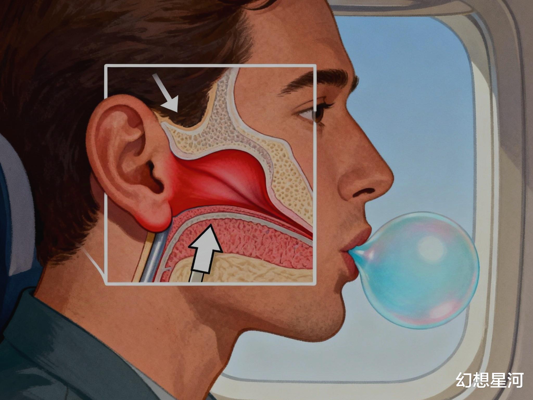 这就是瞬间压差带来的反应,直到连通内外的通道打开,压力平衡了,不适感才会消失。坐飞机时嚼口香糖其实是个很聪明的做法,通过咀嚼动作帮助通道快速打开。给身体调节压力的时间,这也是我们主动配合身体的小技巧。