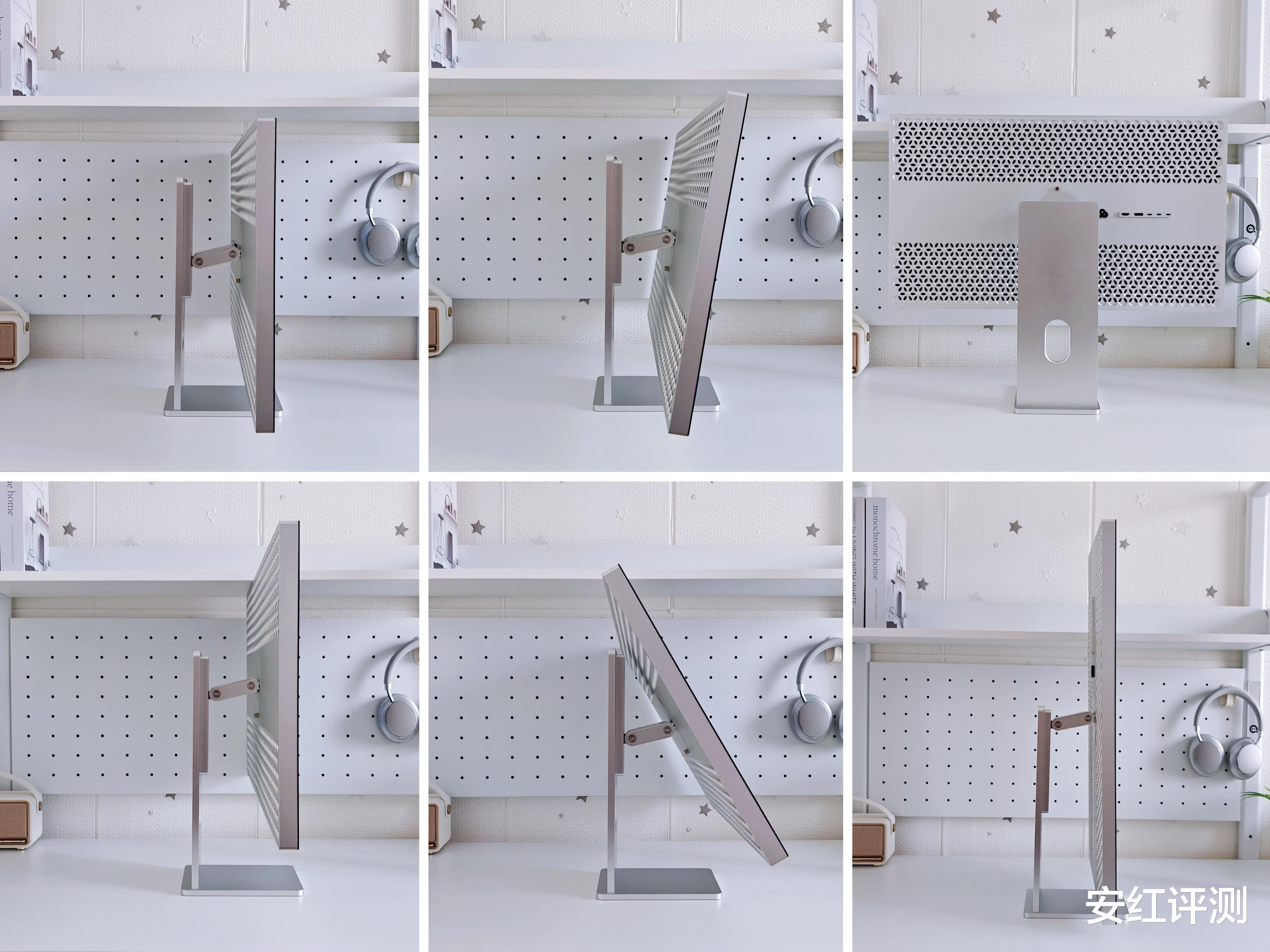 值得一提的是支架支持上下升降、垂直旋转和前后俯仰的多维灵活调节。在调节显示器过程中,可以感受到分级阻尼设置,更利于定制舒适视角。
