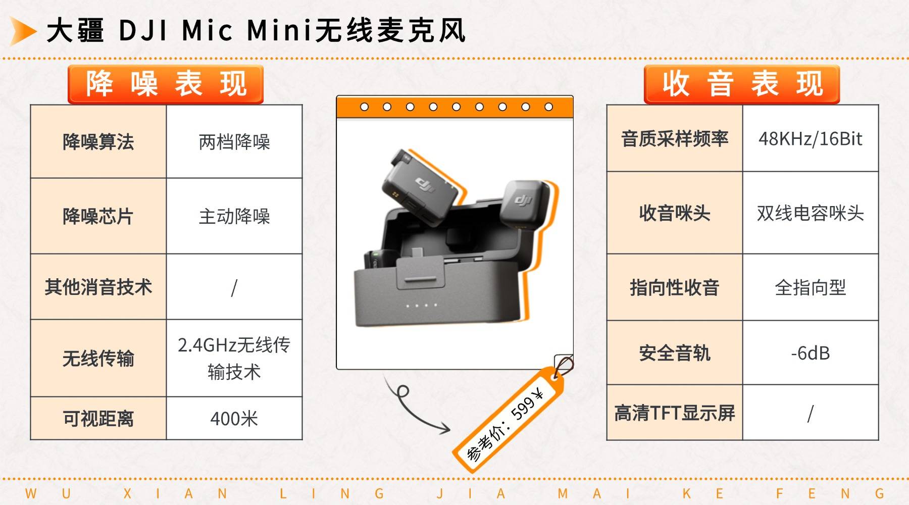 推荐理由:大疆旗下的轻量化入门级产品,10g轻量化设计,佩戴几乎无坠拉感,隐蔽X强。支持两档降噪调节,48kHz/16Bit采样率配合双线电容咪头,还原清晰人声,支持一拖二收音,适配Vlog拍摄、双人访谈等场景,兼顾大疆品控、便携X和实用X,X价比很高。