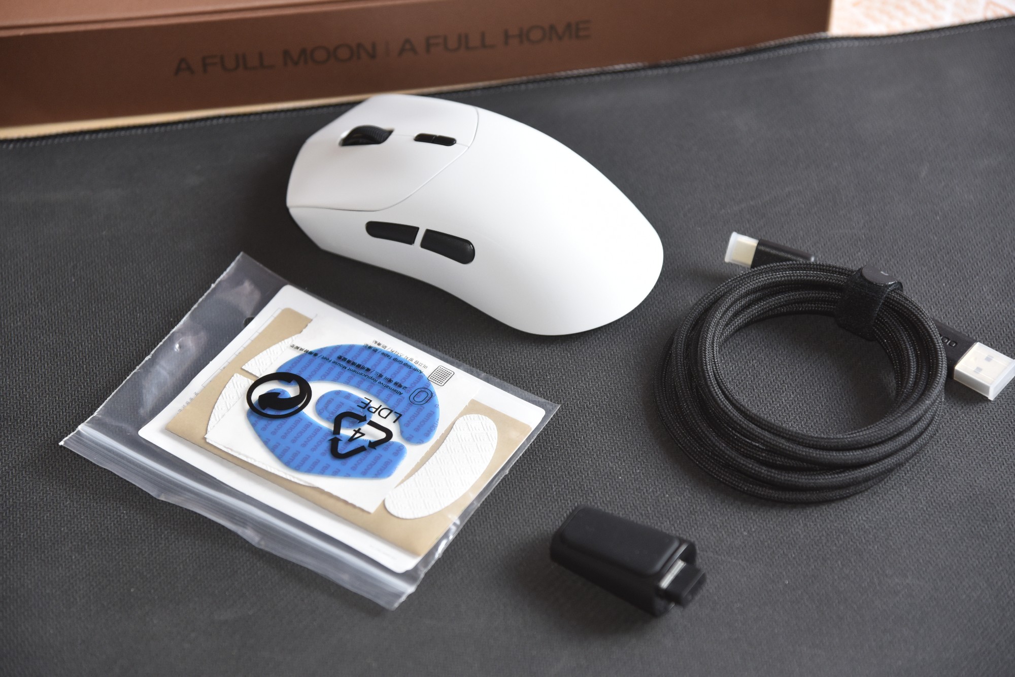 配件方面堪称诚意满满:除鼠标主体外,两款都配备 8K 高速编织线、USB 转接器、备用脚贴和说明书。实测那条带镀金接口的编织线韧性十足,插拔时的阻尼感均匀,配合 USB 转接器使用,能有效减少无线信号干扰,让 8K 回报率稳定输出。