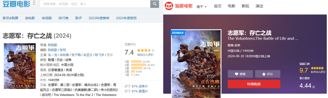 电影《志愿军:存亡之战》自 9 月 30 日上映以来,备受关注,在票房和口碑上都取得了不错的成绩。目前豆瓣评分 7.4 分,猫眼评分 9.7 分。这部电影之所以受欢迎,有以下几个方面的原因: