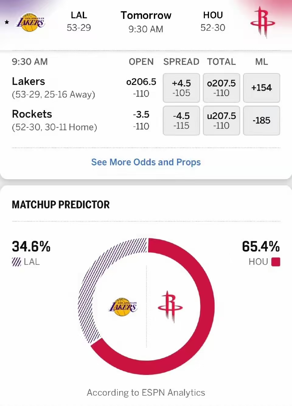 坏消息一:赛前ESPN对本场比赛的胜率进行了预测,认为客场挑战的湖人队仅仅有34.6%的胜率,而主场作战的火火箭队高达65.4的胜率,看来ESPN还是非常看好主场作战的火箭队,这对于客场挑战的湖人队来说绝对是非常坏的消息。