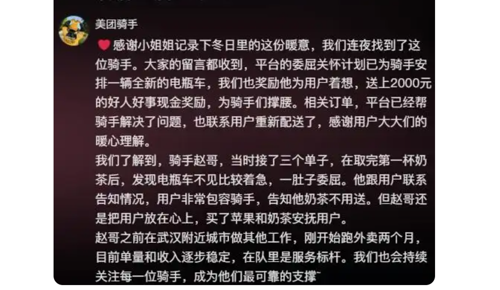 不过最近也不全是糟心事儿,武汉这位「外卖大叔」就暖到了不少人。11月20日,50岁的赵师傅丢了二手电动车,手里还有订单送不了,急得给顾客哭着打电话,结果后来竟「自掏腰包」买了苹果和奶茶,跑5公里上门道歉。好在美团很快给了补偿,送了辆新电动车还发了2000元奖金。
