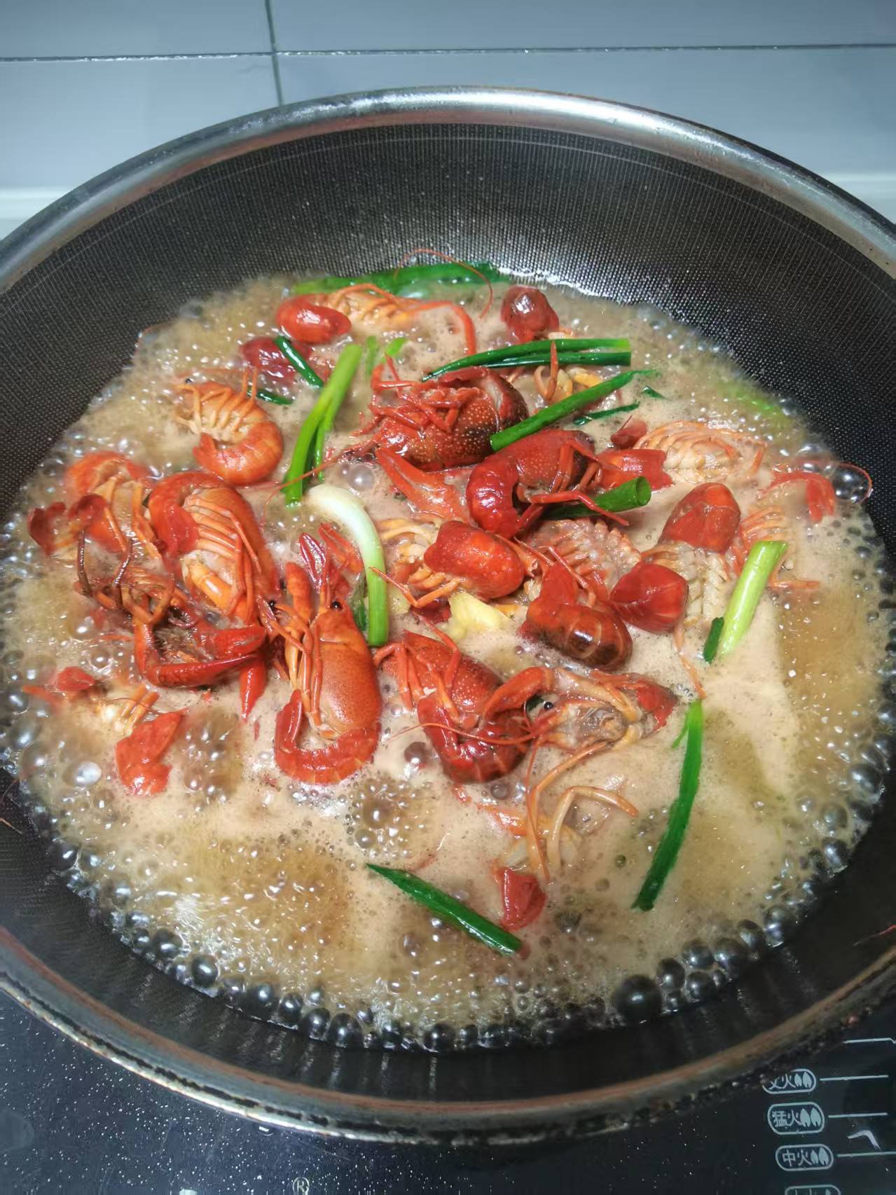 开火、倒油、开始烧小龙虾,现在来看这个调料的确是很简单了,只有生姜、葱,连花椒八角都没有,不过一顿操作之下,这个味道也是一点不差。