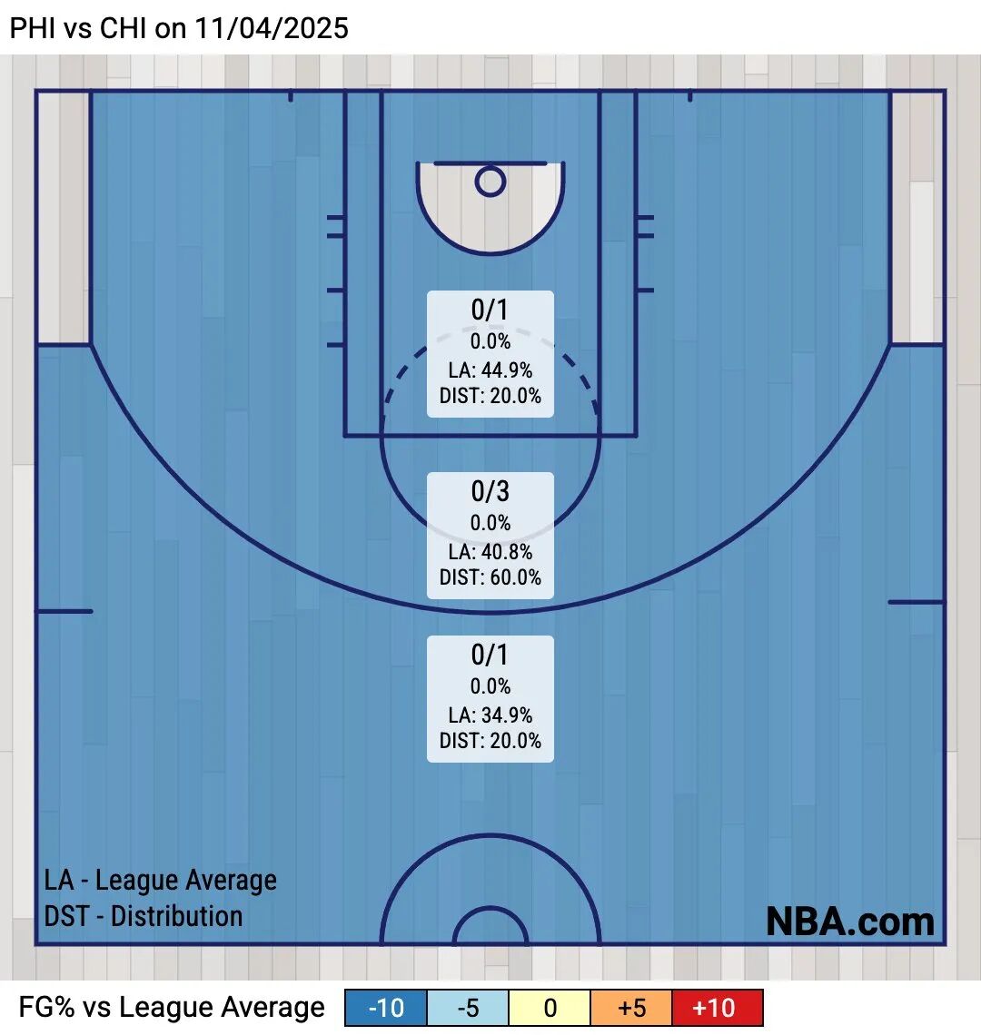 你可以看出来,从恩比德上场之后,76人过半的进攻回合都交给恩比德处理,但是恩比德这期间交出的成绩是:0分5铁1失误1犯规。