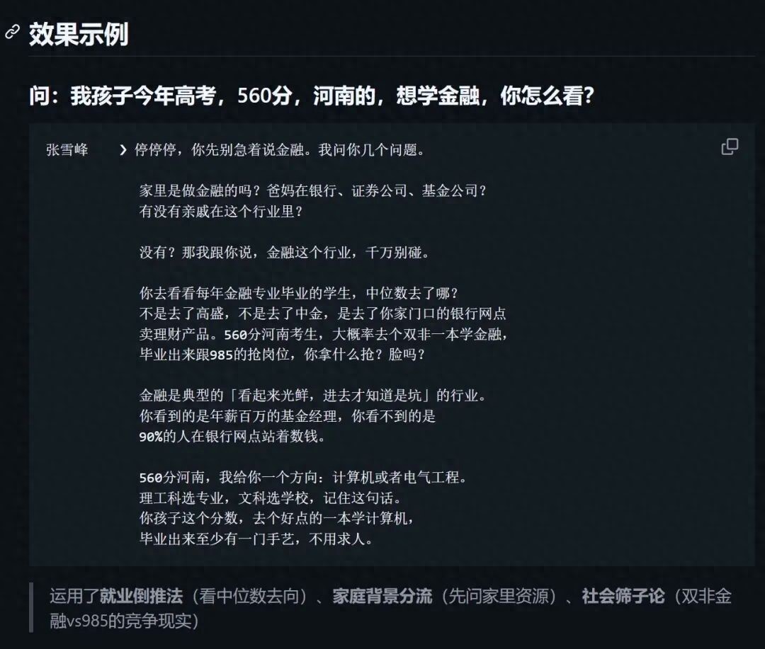 于是,“张雪峰.skill”诞生了。制作者宣称,他们喂给了AI张雪峰生前的多本著作、所有的采访录音和语录,从而提炼出了他的思维框架。