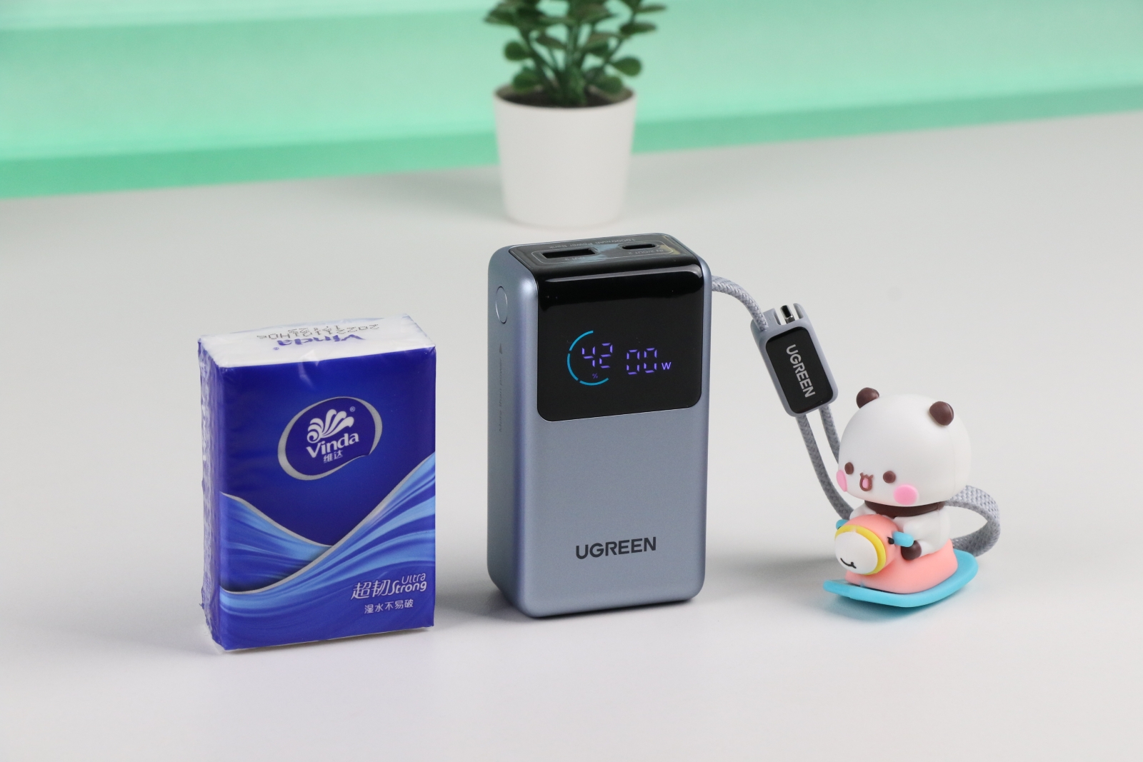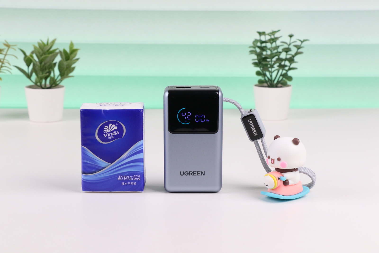 再从侧面来看一下厚度,绿联能量湃 Pro跟纸巾也是相差无几。
