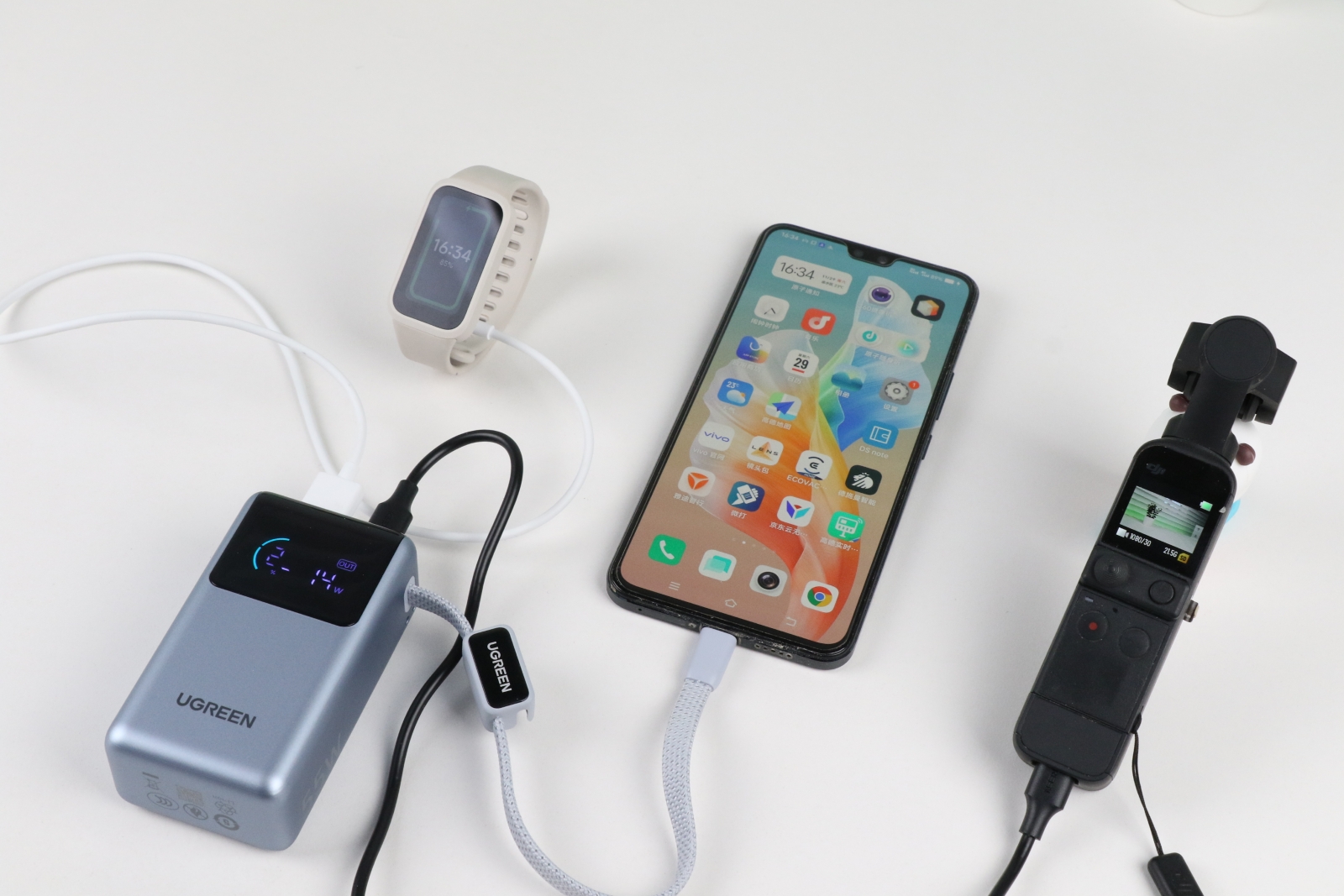 绿联能量湃 Pro可同时为3台设备充电,上图是给手机、Pocket手持云台相机、手环进行充电。