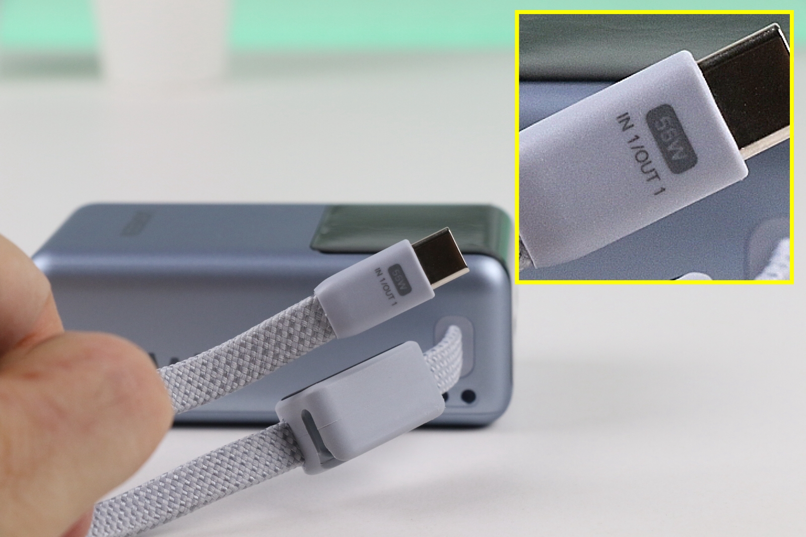 小小的挂绳,细节上一点也不含糊,Type-C插头标注了 55W,以及IN 1/OUT 1,表明这是序号为1的输入/输出双向接口,即:既能为充电宝自充,也能为手机等设备供电。